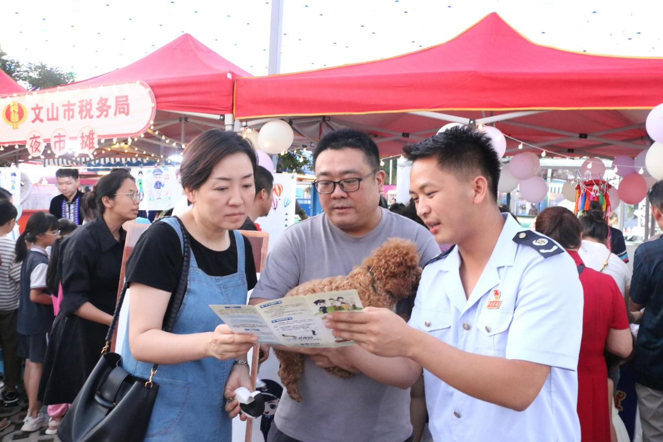 文网讯 5月27日,一场热闹非凡、别开生面的文山税务“春风拂 经济活”税惠夜市活动在文山市盘龙体育场精彩开启,西畴县税务局“税惠千万家 共建现代化”为主题的“店铺门帘”吸引了众多市民前来打卡。