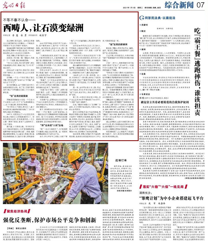 2021年1月5日,《光明日报》刊发记者稿件《西畴人,让石漠变绿洲》,以下是稿件全文。 荒山秃岭,怪石盘亘。这里是云南省文山壮族苗族自治州西畴县,一个被地质专家称为“失去生存条件”的地方。 地处滇桂黔石漠化集中连片特困地区核心区域,西畴99.9%国土是山区,75.4%土地石漠化,25万人生活在石头窝窝里。 然而,西畴人不等不靠不认命——在悬崖上用大锤一锤一锤地打,用凿子一下一下地凿,凿出条条脱贫路;“向大石头要地,向石旮旯要粮”,把石头垒成地埂,把泥土填成土地,“无中生有”造出良田;自发达成“占地不补、拆房不补、砍树不补”的共识,舍小家顾大家,让石头窝里阡陌相通…… 在西畴,一个又一个当代“愚公”凿石开路,用行动证明了没有什么“不可能”,没有什么“干不了”。 如今的西畴县,62个贫困行政村早已全部实现脱贫出列。脱了贫,不等不靠的当代“愚公”们带领群众又踏上了乡村振兴新征途。 “凿”出来的致富路 西畴县西洒镇岩头村是一个只有15户人家的小山村,村子“长”在悬崖峭壁之上,由于不通公路,发展举步维艰。 “村子里有六个媳妇,熬不住了,跑了再也没回来,就连我的媳妇也跑了。”岩头村村民小组长李华明回忆。 1997年,村里挖出了4.5公里长的简易公路,但最后1公里被悬崖挡住了。村民抬肥猪出去卖,走到悬崖那里,一不小心脚一滑摔下悬崖,猪滚下山崖摔死了,人受了重伤。 路不通,日子熬得心酸。李华明不甘心村子就这样被困住,立志“就是砸锅卖铁也要带着大家把进村路打通”。然而,他刚提出修路的想法,马上就有人和他打赌,能把这条路修通,自己就用手掌心煎鸡蛋给他吃。 2003年春节刚过,村民们终于达成一致:每户集资2800元,每户出一个劳力来修路。缺乏青壮年,老老少少齐上阵!铁锹断了,换;手磨破了,忍;人滚下坡去,爬起来! “人真是逼出来的,悬崖下有人家、电线,不能用炸药炸石头,只能用铁锤打,用錾子凿,用膨胀剂撑。”李华明说。用膨胀剂把石头撑裂,需要有人吊在悬崖上给石头打炮眼,李华明第一个系上绳子,不顾危险在山石间晃来晃去。 历经12年苦干,2014年1月,岩头村终于修通了最后一公里的进村简易路。接着,县政府出资16万元,群众投工投劳硬化了路面,圆了祖祖辈辈的通路梦。 “路通了,几十年没出过村的老人也可以坐车赶集了,孩子们上学也不要大人送了,村里人生病也不用担架抬了,跑到娘家的媳妇也回来了。”李华明说。 “打通了出村‘最后一公里’,还要打通致富‘最后一公里’。”路通了,李华明想得更多的,就是怎样让人能出去也能回来,在家门前增收致富。 为发展产业,近两年岩头村先后引进了500头生猪代养点和1.5万羽规模的乌骨鸡养殖合作社等项目,村集体经济从无到有慢慢壮大。 眼下,李华明与村民正在谋划一个新项目——开办“最后一公里”农家饭庄,为一批批前来学习西畴精神的学员提供就餐场所。除了开办农家乐,李华明还谋划着邀请县里有名的中药材致富带头人来村里把脉指导,尝试种植苦参等中药材。 “炸”出来的“三保”台地 “嘭!”一块石头被炸开了,人们赶紧把石头搬到土地边上垒成石埂。这一场景来自西畴县蚌谷乡木者村么石谷。 如今,炸石声音早已消散,只剩下“第一炮”三个大字赫然矗立,讲述着木者村的今昔之变。 20世纪80年代的么石谷,乱石林立、干旱缺水,土地夹在石缝中,“山大石头多、出门就爬坡,春耕一大片、秋收一小箩”展现着村民的无奈。 “当时我们村是远近闻名的‘口袋村’。”木者村村民刘登荣说,因为生计,村民不得不拿着口袋外出借粮,年年缺粮年年借,年年借粮年年还。 漫山遍野的树消失殆尽,石头裸露越来越严重,土地越来越少。怎么办?时任村党支部书记的刘登荣发了狠:“搬家不如搬石头。把地里的石头炸了,搬开,改造田地!” 1990年12月3日,第一炮炸响。这一炸,不仅炸出了一条生路,也炸出了村民的参与热情,炸出了“搬家不如搬石头,苦熬不如苦干;等不是办法,干才有希望”的西畴精神。 那一年,全村男女老少齐上阵,经过105天奋战,把360多亩土地从石旮旯里“刨”了出来,成为“保土、保水、保肥”的“三保”台地。 第二年,木者村玉米迎来大丰收,亩产由过去的200多斤增加到了800多斤,“口袋村”变身“余粮队”。 自此,“搬家不如搬石头”在西畴广为流传,不少村寨开始动起来,向顽石开战,向山旮旯要田。 面对人均耕地不足0.78亩的困境,西畴县引导群众发扬“搬家不如搬石头,苦熬不如苦干”的精神,用铁锤砸、錾子錾、炮杆撬、炸药炸,开山炸石、垒埂造地,开展坡改梯和中低产田改造,把“跑土、跑水、跑肥”石旮旯山地变成了“保土、保水、保肥”台地,全县累计实施中低产田地改造、土地整理24.4万亩,新增耕地9046亩,人均耕地增加0.4亩,成功解决了农民吃饭问题。 初步估算,西畴人民搬石炸石造地和坡改梯,垒成的石埂加起来长达5万多公里,可绕地球赤道一周。 “治”出来的新绿洲 脱贫前,西畴人用双手去开山、铺路、造田。脱贫后,西畴人依然敢拼敢干,去发展产业,去创造奇迹。 已过古稀之年的老党员、中药材种植“能手”程敦儒就行走在带领百姓增收致富的路上。 开砖厂、种三七,程敦儒曾经是当地屈指可数的“有钱人”,但1987年,一场意外的大火烧光了他一整个仓库的三七,生活把他逼上了绝路。 “那时孩