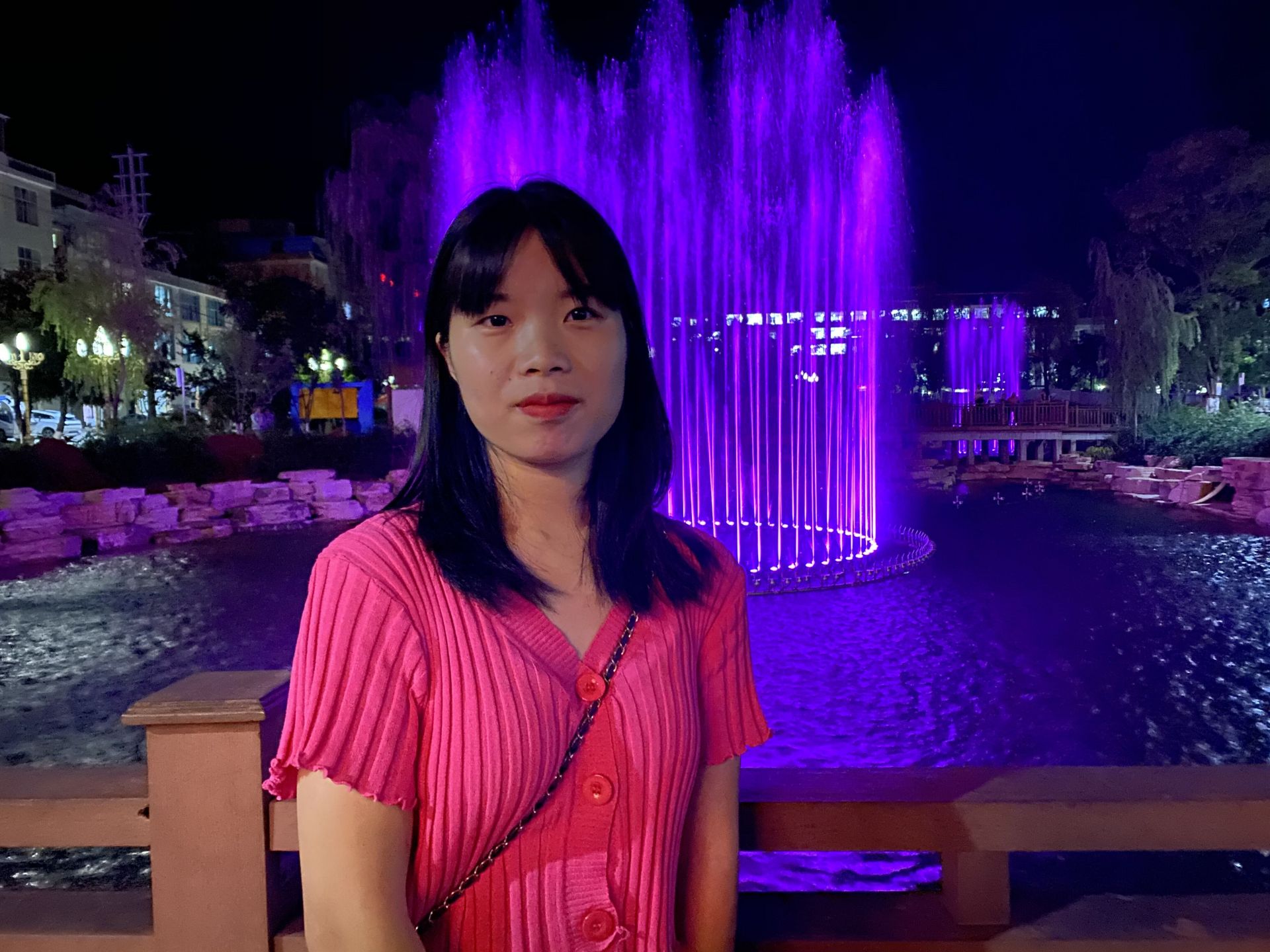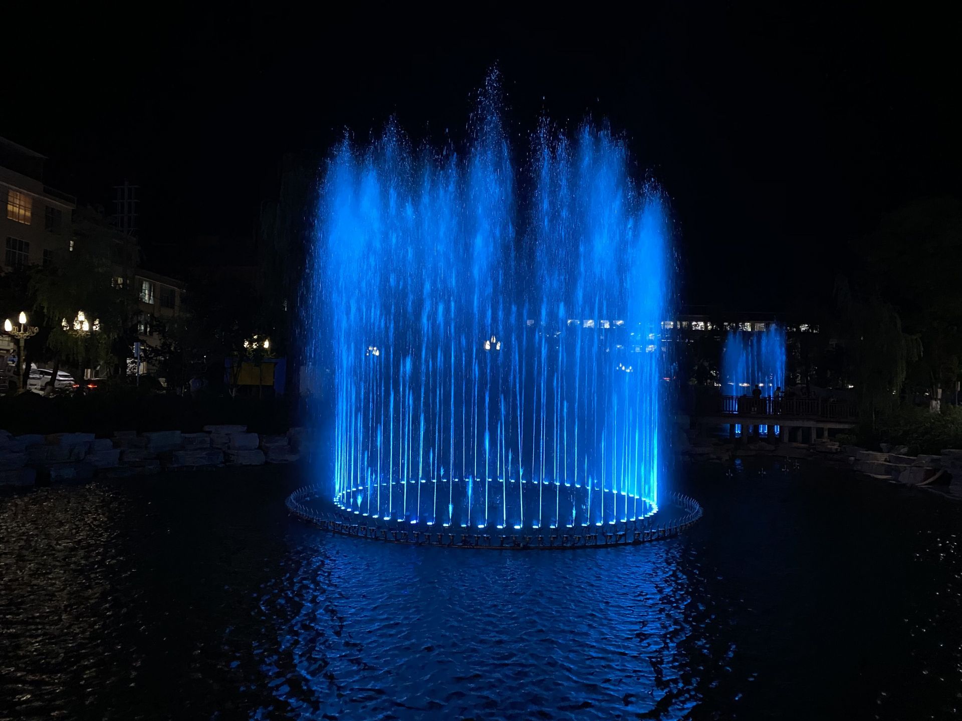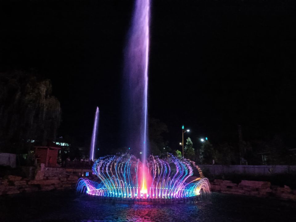 随着音乐节拍响起,喷泉开始喷涌而出,有时像波浪,此起彼伏;有时像一只大花篮,里面装满了各式各样的花朵。喷泉在不同颜色灯光的照射下,变幻万千,引得观者惊叹连连。