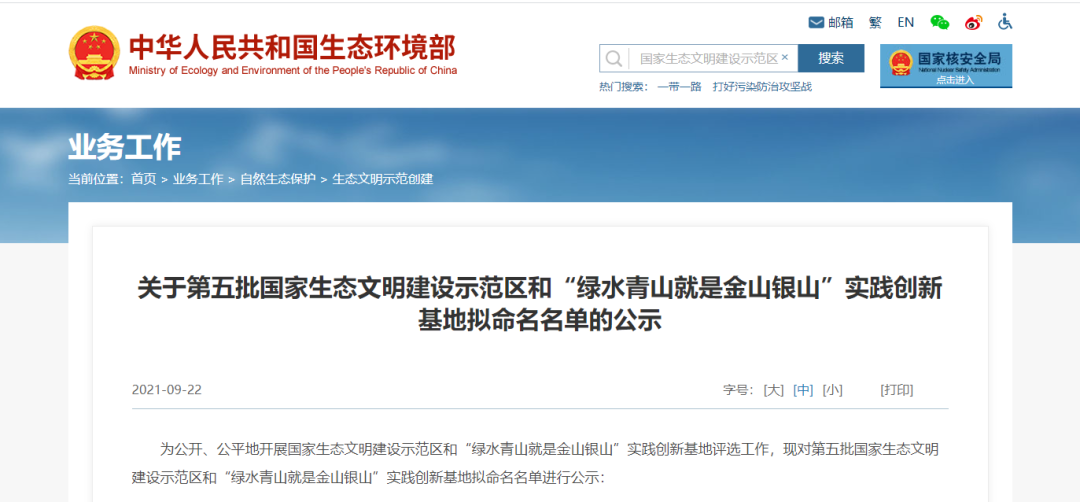 为公开、公平地开展国家生态文明建设示范区和“绿水青山就是金山银山”实践创新基地评选工作,现对第五批国家生态文明建设示范区和“绿水青山就是金山银山”实践创新基地拟命名名单进行公示: