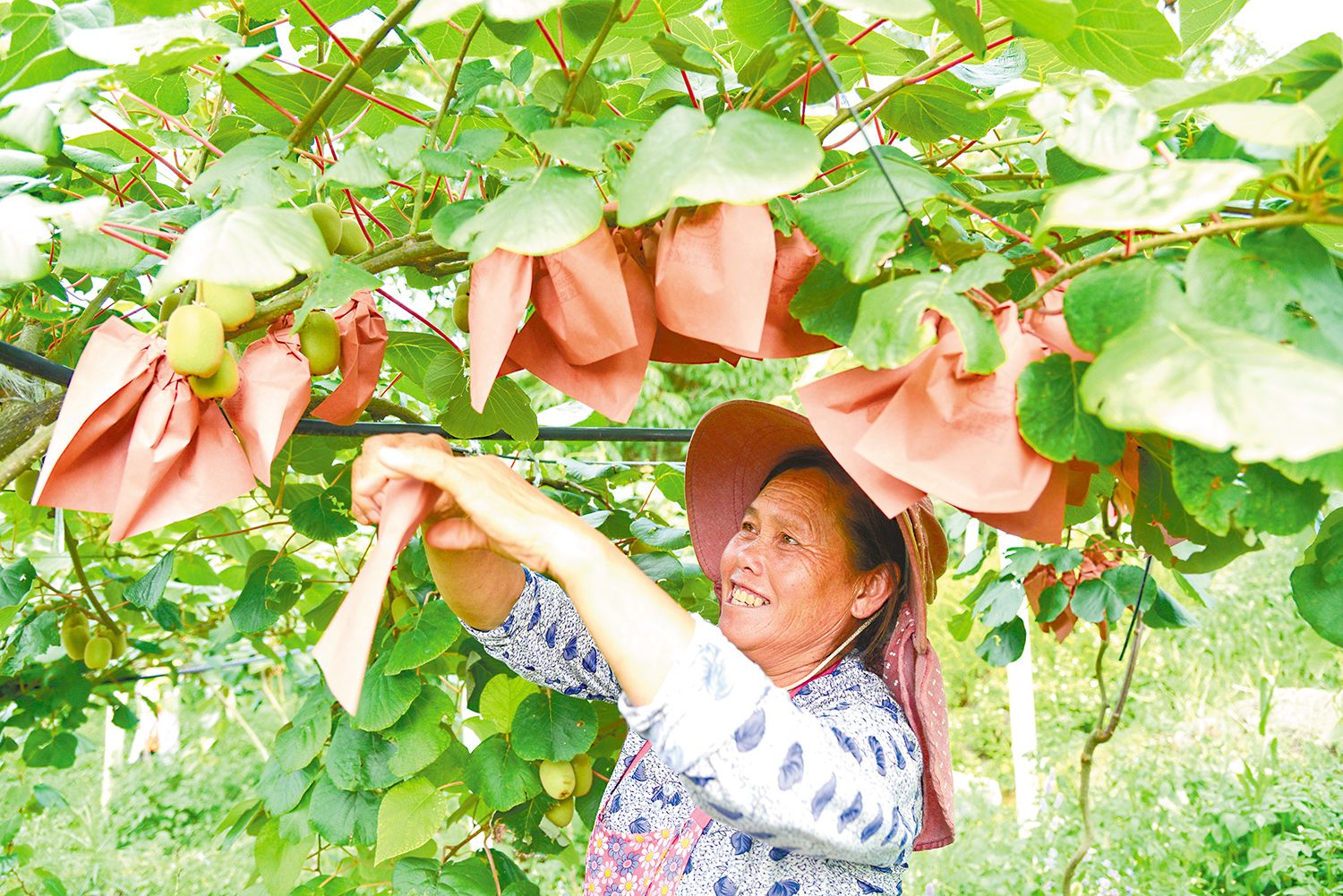村民在基地给即将成熟的猕猴桃套袋