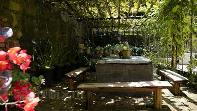 太阳西斜,阳光慢慢透过枝叶缝隙,静静洒落在葡萄架下的桌椅上,大家边吃边聊,享受着这和谐安宁的下午时光。
