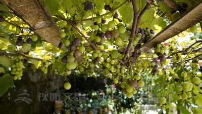 记者仔细观察一番,见只一根粗壮的葡萄藤从后卡村党支部书记付正升家院子的墙角长起,数不清的藤条沿着架子肆意生长,爬过围墙,在隔壁的老村支书叶传荣家又长开一大片来。盛夏的午后阳光热烈,却穿不透这密实的枝叶,星星点点地映照在半红半绿的葡萄上,煞是好看。