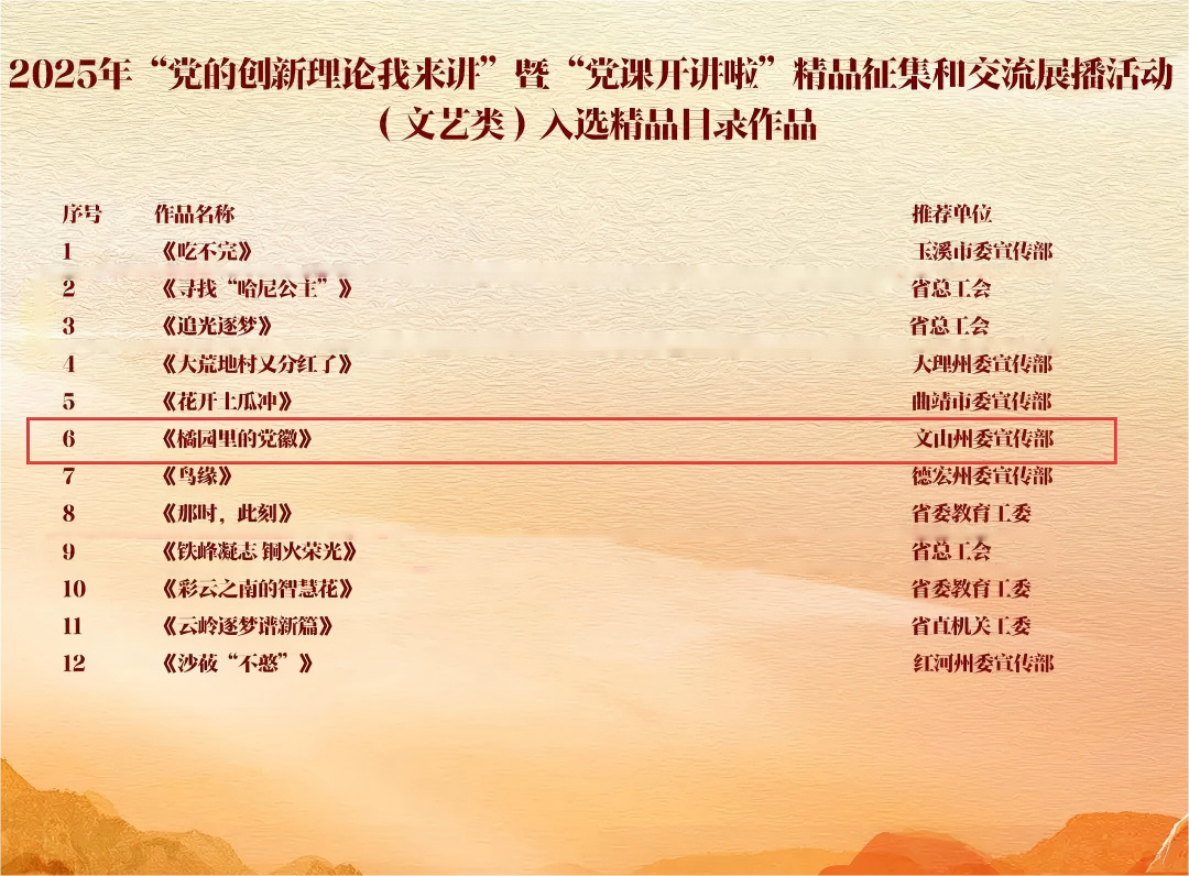 据了解,《橘园里的党徽》是由文山州委宣传部推选上报,经西畴县委宣传部组织选送。该作品从全省16个州(市)及多行业领域,经过层层推荐和专家指导、审核把关,最终入选省级理论宣讲精品,并荣获2025年文山州“党的创新理论我来讲”暨“党课开讲啦”精品征集和交流展示活动优秀宣讲作品。