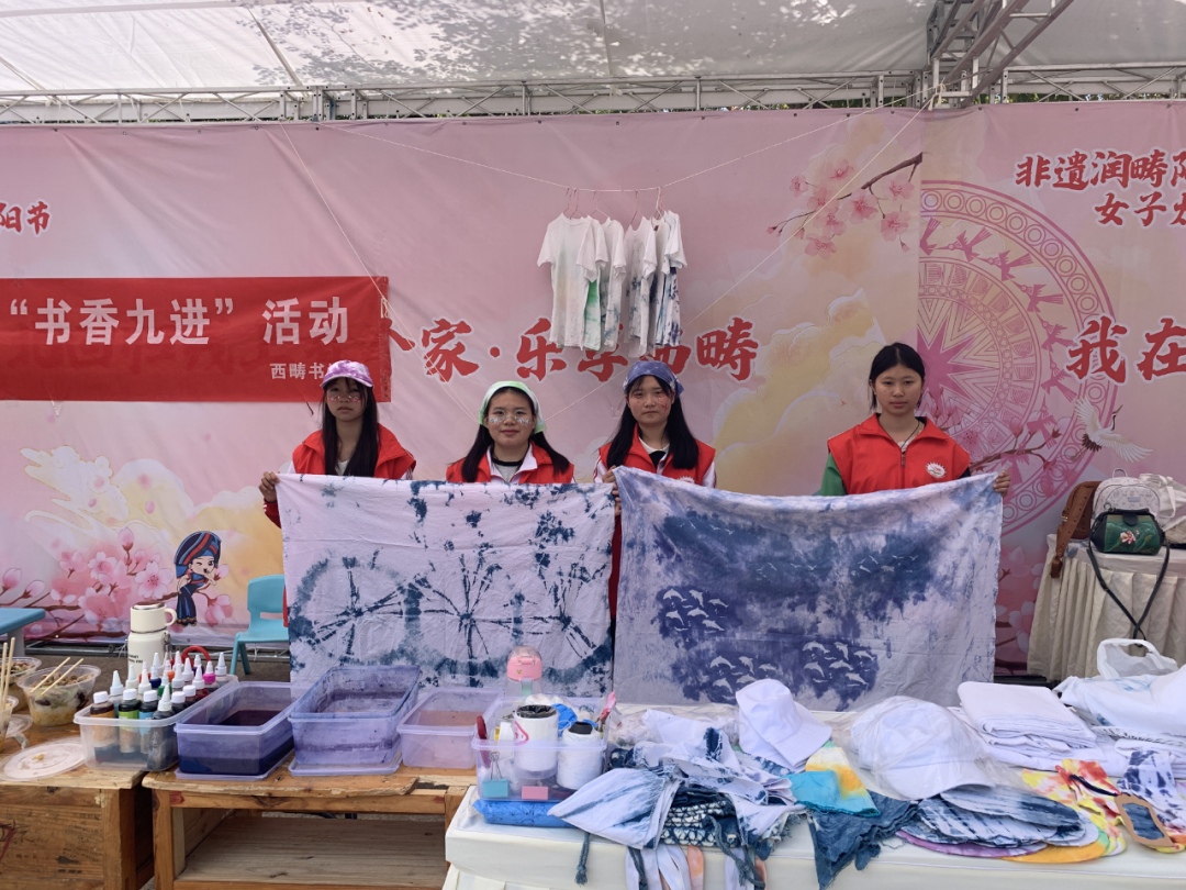 扎染展区内,老师带领学生们现场演示扎结、浸染、漂洗全流程,让群众直观感受非遗魅力。师生挖掘地方特色,将西畴喀斯特山峰、壮家裙摆线条、北回归线蓝天白云等元素融入扎染工艺,蓝白纹样藏着西畴山水记忆,承载地方文化基因。学生作品获得群众称赞,既推动了非遗活态传承,又实现传统手艺与时代审美的融合,彰显职业教育在文化传承中的支撑作用。