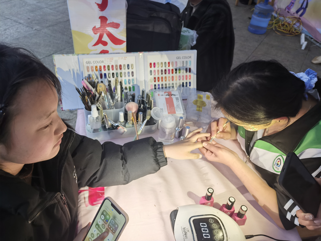 彩绘展区精彩纷呈,学生以笔为媒,将西畴喀斯特地貌与民族风情绘于脸部。“让孩子们用自己的眼睛看西畴、用手画西畴,作品才会有温度。”一名老师的话,道出了作品地域特色与人文温度的真谛。服装缝纫展区,缝纫机声不断,学生针脚细密,为群众修改裤脚高效利落,获大姐满意称赞。美甲展区深受年轻姑娘喜爱,学生将西畴蓝靛色调、银饰纹样等元素融入美甲,让群众眼前一亮。“能把美带给别人,自己心里也美。”带队教师的话彰显出职业教育在助力文旅发展中不可或缺的作用。