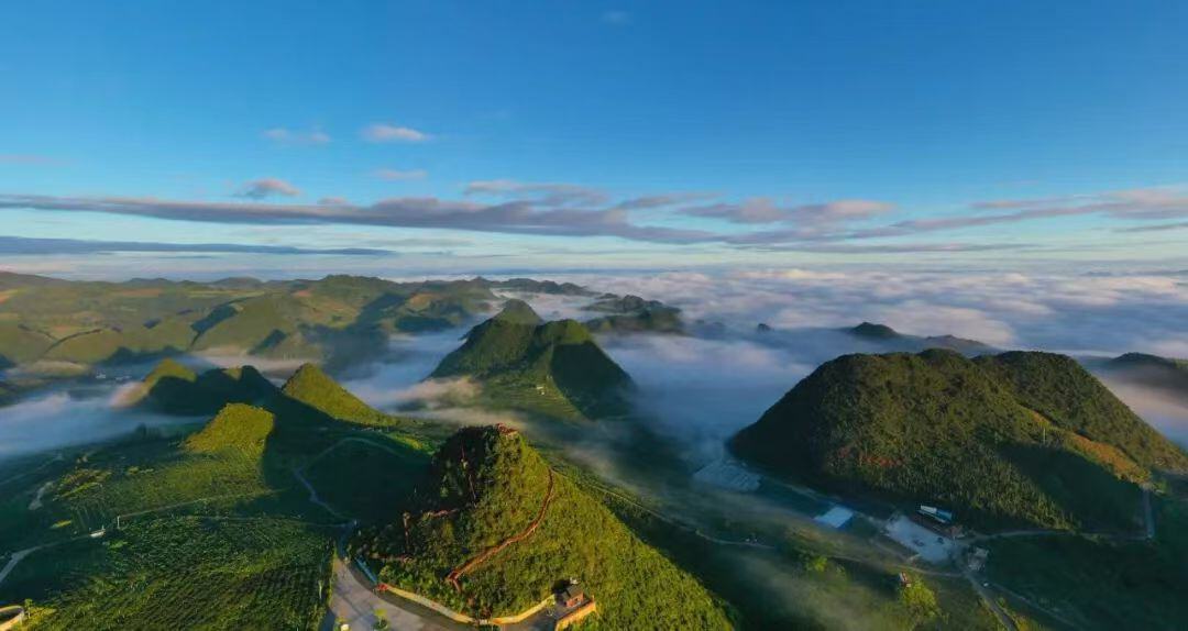 如今再登观景台,眼前早已换了天地:千亩猕猴桃顺着山势铺展,翠绿藤蔓缠绕支架,饱满果实挂满枝头,风一吹绿意翻涌如大地五线谱;清晨云海缠绕喀斯特峰丛,阳光穿透云层洒向田间,雾气袅袅中宛如流动的山水画卷——曾经裸露的岩石,如今已被绿色牢牢覆盖。
