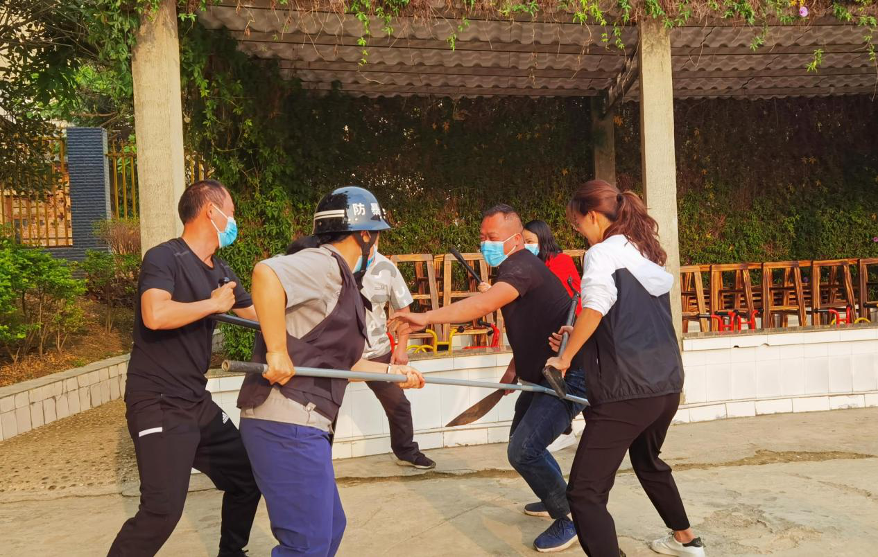 演练现场,“暴恐分子”持刀凶猛而快速地闯进幼儿园,幼儿园老师和安保人员奋不顾身与歹徒周旋,尽力阻拦歹徒进入校园,同时拨打电话报警。接警后,民警火速赶往现场与“暴恐分子”搏斗,并将其缉拿带走。