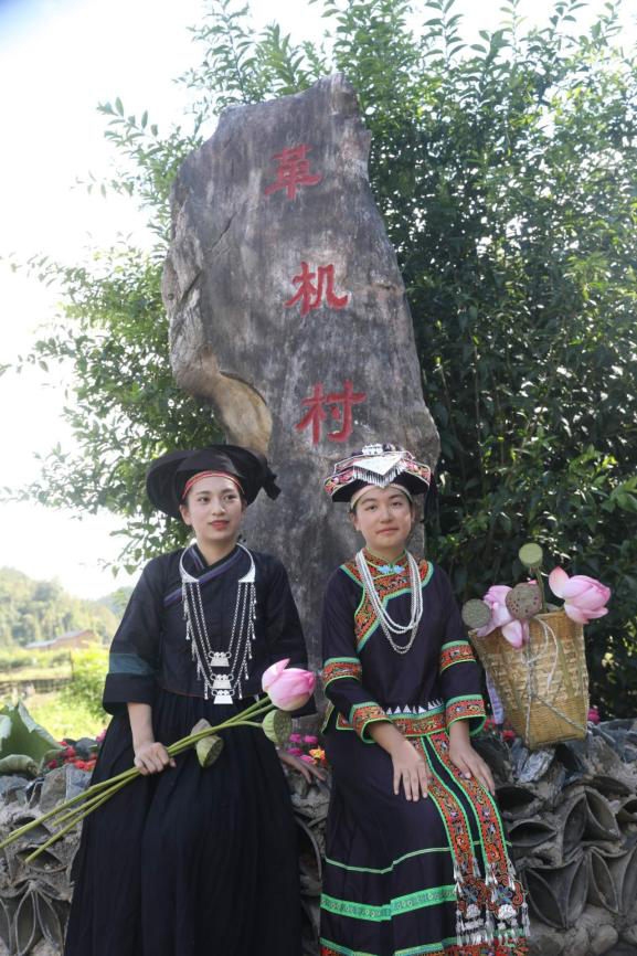 革机小寨注重对壮族传统文化的挖掘,1987年在革机地区出土的古陶片,揭开了一段古代壮族人民生产生活的那勃记忆。为了发扬那勃文化,在绿美乡村建设中,紧密围绕壮族传统文化,沿路围栏、景观墙展示壮族传统文化元素,文化广场展示竹筐、铁犁等农耕用具,以陶艺、石艺、木艺、铁艺等多种形式展示壮族传统文化元素,真实还原了壮族人民生产生活的场景,留下一段不朽的民族记忆。