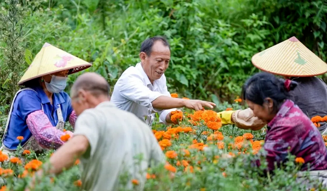 2022年4月,第一粒万寿菊种子落入拉孩的土地。从育苗到移栽,他几乎天天泡在田里。盛夏午后,山风裹着暑气,他蹲在花丛中教村民打杈:“侧枝不掐,花就长不大。”汗沿着黝黑的脸颊滑落,滴进土里。秋收时,橙黄的花海铺满山坡。秤杆一次次抬起,数字跳动:1100亩,销售收入近400万元。蜂子洞村的蒋以成种了110亩,增收30多万元,他攥着一沓钱,眼眶发红:“刘代表,这花……真成了致富花!”