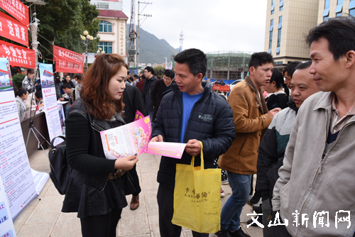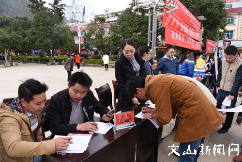 文网讯 2月7日,2017年西畴县“迎新春 促就业、惠民生、保用工”春季现场招聘会在县城北回广场招聘现场。西畴县人力资源、社会保障、县残联等部门开展送岗位、送技能、送服务、送政策活动,龙翔地产、文山石油、砚山美泰玩具、云南卡尔特、云南希伦德等10余家企业到现场招聘职员。(蒋天辉 摄影报道)