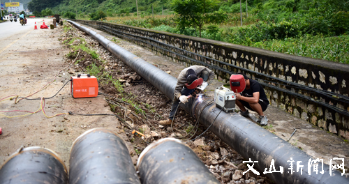 近日,工人们正在下新民村加紧施工焊接、安装水管。
