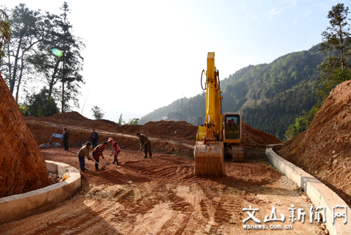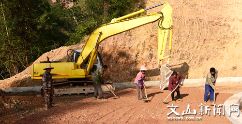 12月26日,西畴县法斗乡石马头村群众正在铺筑水泥路面的基础。