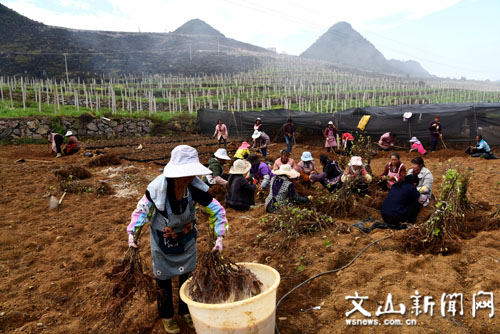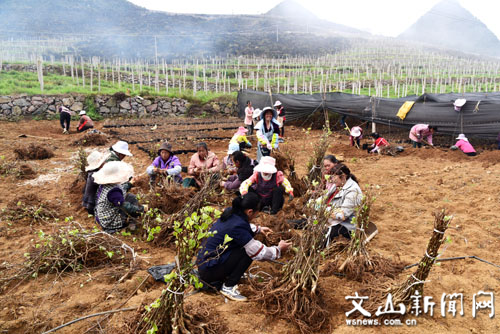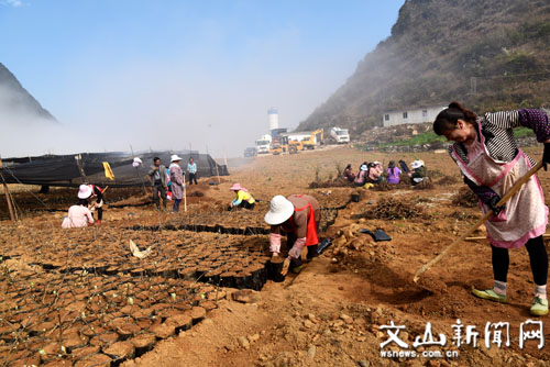 文网讯 当前正值种植猕猴桃育苗装袋时节,西畴县在三光石漠化片区种植猕猴桃面积1500亩,今年在空山村、大坪子村扩大种植,当地30多名留守妇女实现在家门口就业,做猕猴桃苗装袋、剪枝、消毒、移栽等活,每天可获70—80元的工资。图为近日三光片区留守妇女在猕猴桃育苗装袋。