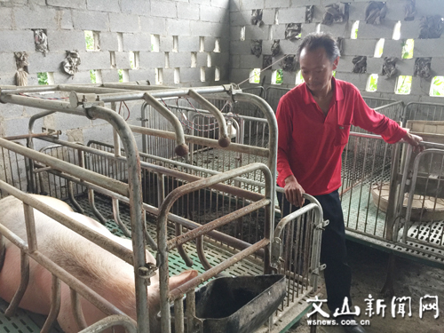 “这头是正月二十七买的,差不多7月初就要生了!”韦多荣喜滋滋地看着圈里的这头母猪。“旁边这头是农历二月初二买的,估计是新历的8月份生。”他弯腰看了看猪圈上挂着的一个小纸片,转身告诉记者。韦多荣是西畴县董马乡锅地塘村委会岩洞村小组的村民,建档立卡贫困户,这两头母猪是他今年年初买的育种母猪。