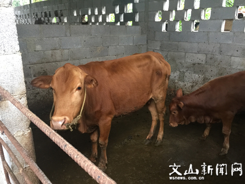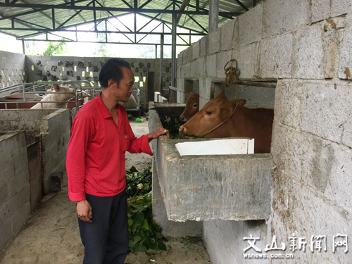 2014年,韦多荣家被确定为建档立卡贫困户。2016年,在农村危房改造资金的帮扶下,他在破旧的土坯老房子隔壁建起了砖混新房,居住环境有了保障,但是一直没有钱来搞产业。恰好在这个时候 ,一个矿产公司征用了他家的部分地,补偿金4万多元。同时,西畴针对每家建档立卡户,有5000元的产业发展资金。手上有了本钱,不甘贫困的韦多荣有了自己的想法:“当时家里有三头牛,有几头猪,门口又有一块空地,于是我和家里人商量,干脆在家门口整一个养殖场。”