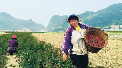 近年来,云南省西畴县莲花塘乡大力拓宽群众增收渠道,针对无能力外出务工的留守人群,引进了收益见效快、效益周期长的食用金边玫瑰产业,通过“公司+基地+农户”“党组织+合作社+农户”的发展模式带动群众发展。据了解,目前该乡已种植食用金边玫瑰600余亩,实现创收200余万元,带动300余农户实现增收。图为莲花塘乡炭达村村民正在收获玫瑰。