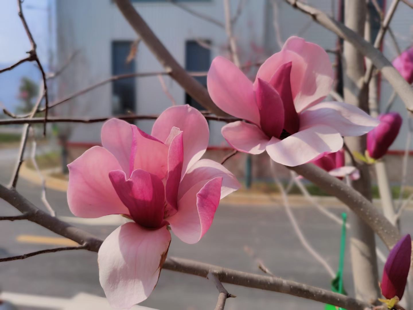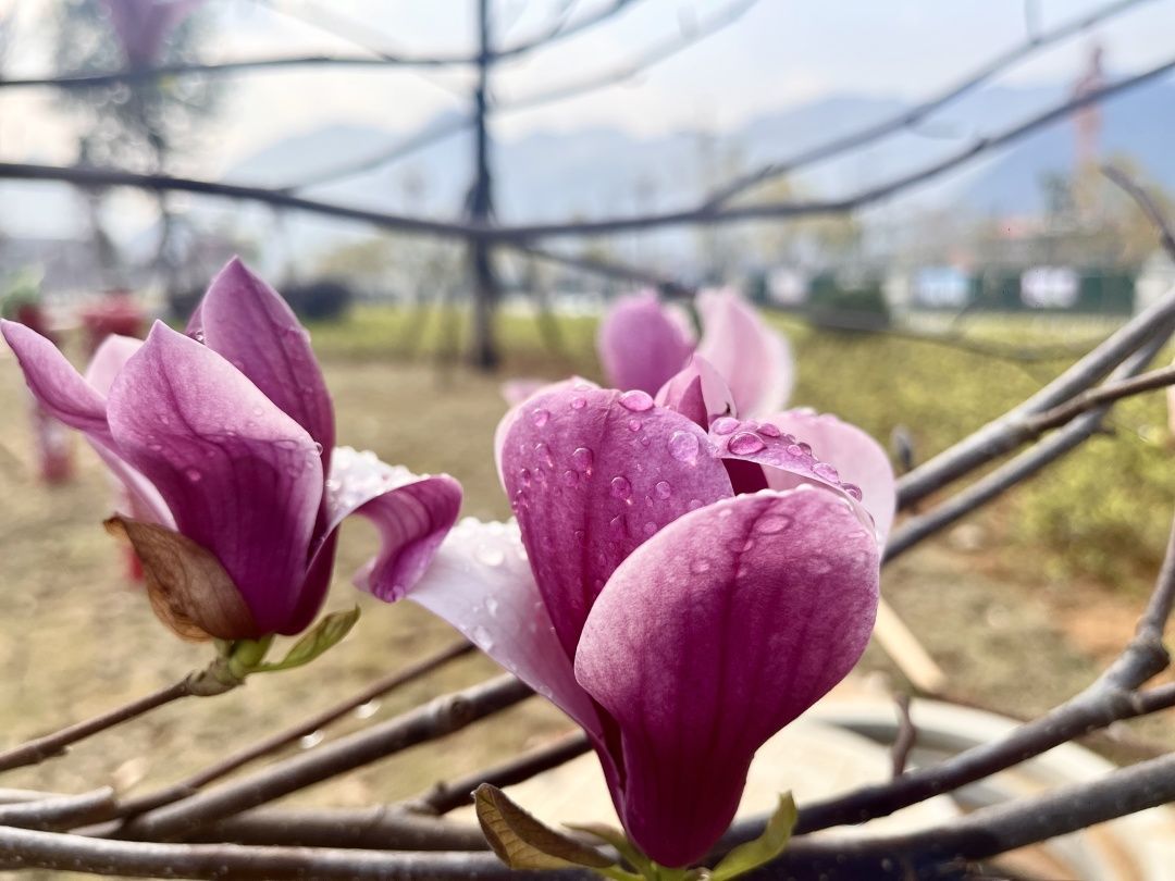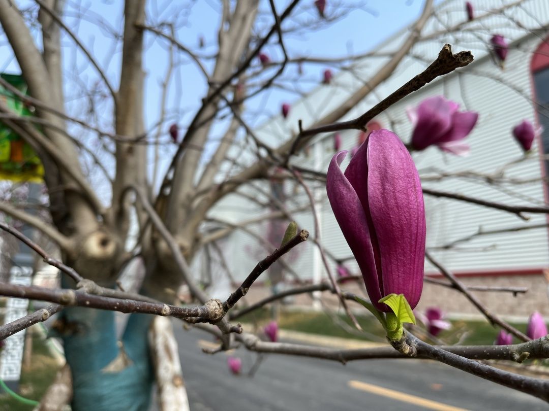 在兴街镇工业园区内,阳光和煦,微风正好,玫紫色的木兰花,被照耀得格外大气从容,含苞待放的木兰花,别具风情,水滴打湿的木兰花更显得娇艳欲滴。