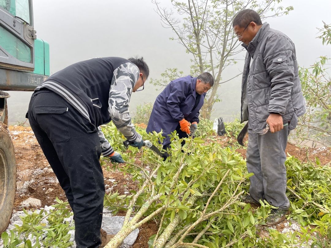 虽然有机械省力,可干部群众干起活来是一点也不含糊。苗木落地后,大家就在技术员的指导下锯掉干枯的枝干,修剪杂枝,再蘸取白乳胶涂到创口处。苗木处理完毕,干部群众合力将树木扶起栽入坑中,调整树木方向保证美观,再由挖掘机铲来泥土回填。“把根埋浅一点,树才好成活!”在技术指导员的指导下,大家用锄头培土踏实,并用竹竿、绳子固定苗木。
